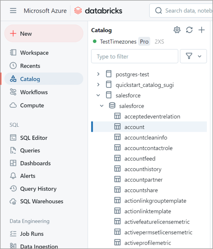 You can also return to Catalog in the navigation pane and find the catalog you just added. Expand the catalog to view the objects in the catalog.