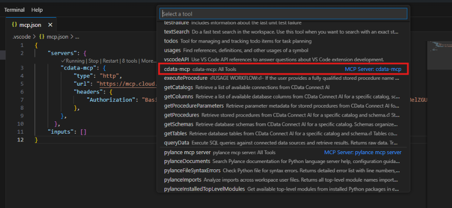 Click Add Context in the bottom of the Chat pane. In the search bar, select Tools. Then search for CData. Add cdata-mcp All Tools.