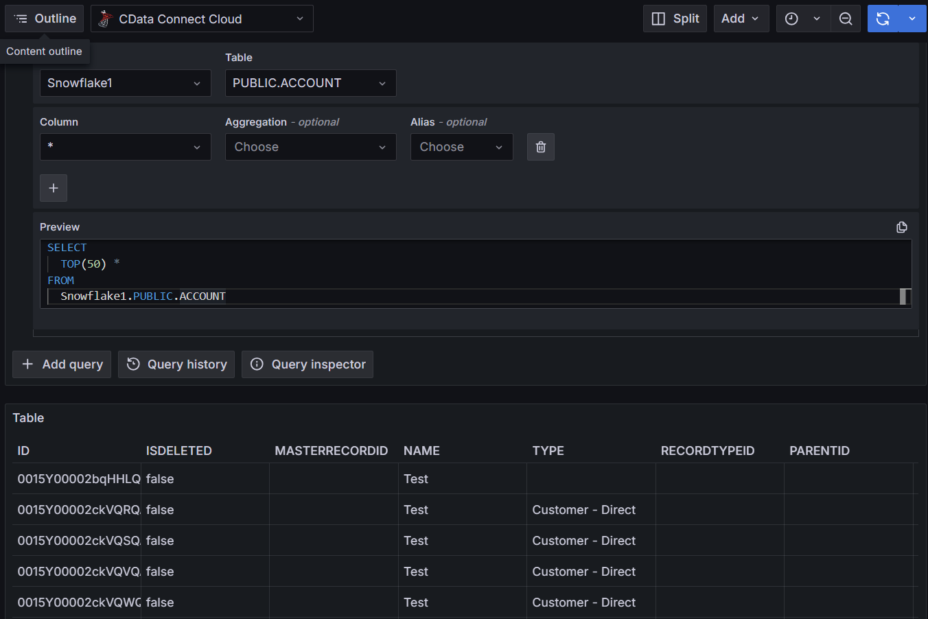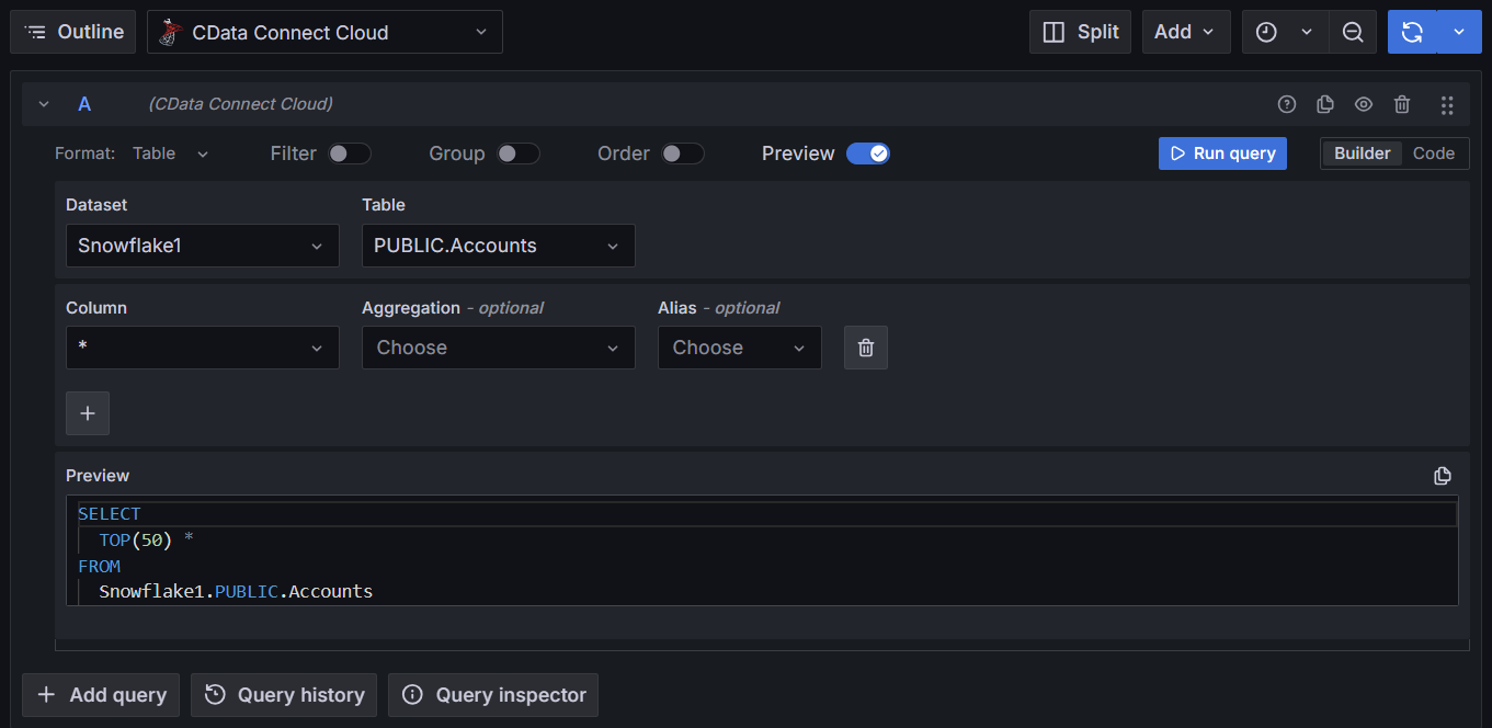 Select the connection you created. Choose the tables and columns you want to query.