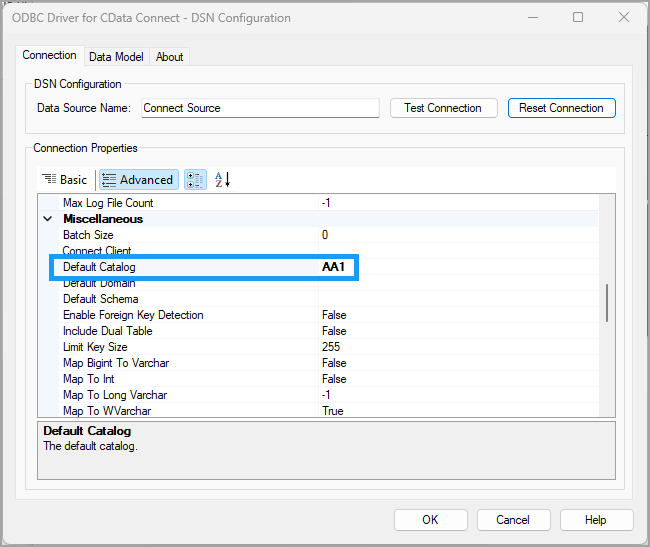 In the Advanced tab, in Miscellaneous > Default Catalog, enter the name of the connection set up in the prerequisites.