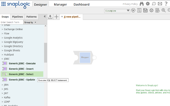 Click and drag a Generic JDBC - Select snap onto the designer.